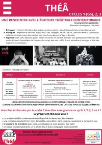 Théâ favorise la rencontre entre les écritures théâtrales jeunesse d’auteurs vivants et les enfants et adolescents : lire, voir, mettre en voix, danser, mettre en jeu... Les pratiques artistiques proposées prennent appui sur la philosophie de la coopération à l’école et s’inscrivent dans des projets de classe : le partenariat enseignant-artiste est une donnée nécessaire et essentielle, au coeur des projets Théâ.