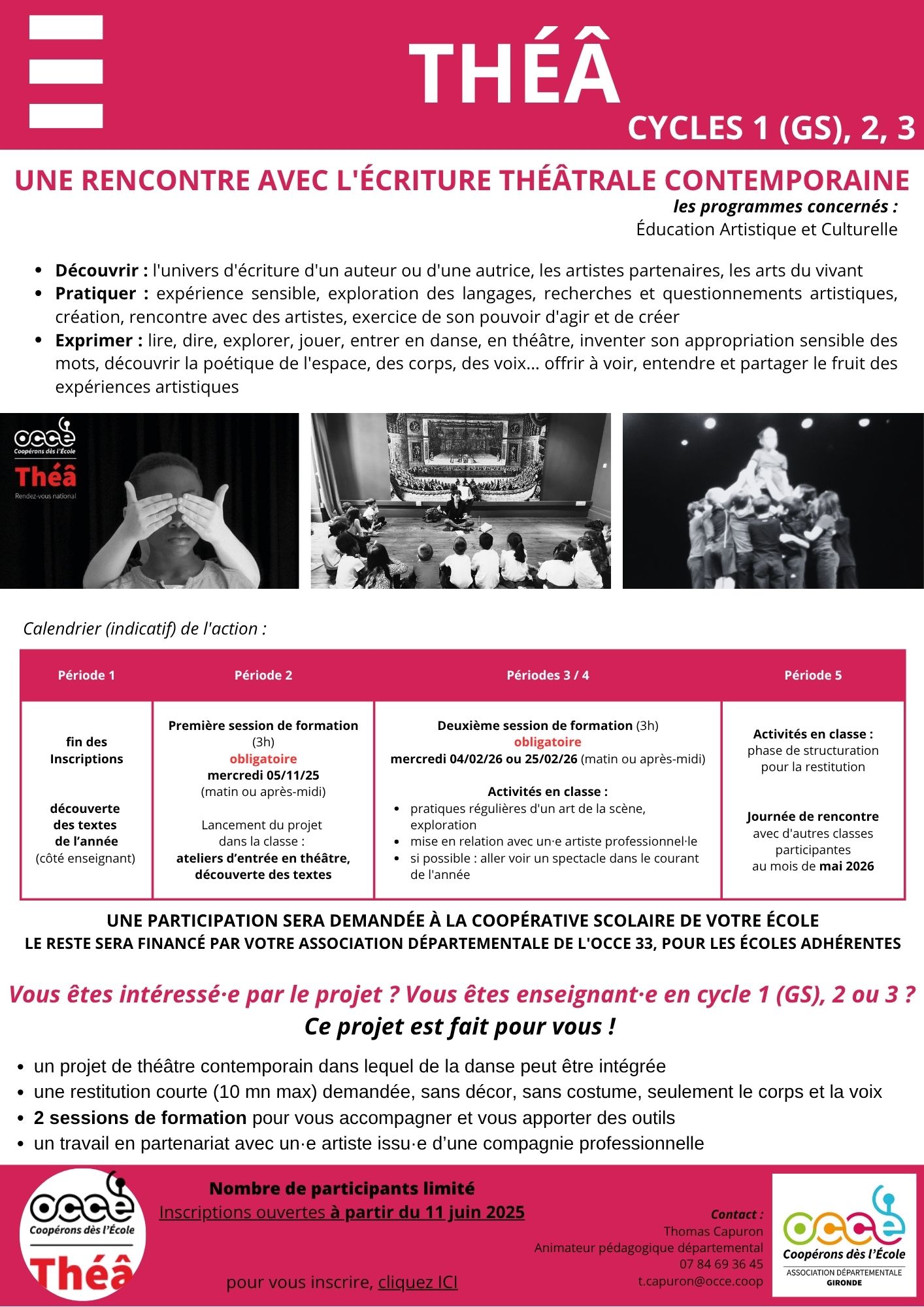 Théâ s’adresse à toutes nos classes adhérentes, de la GS à la 3ème, ASH compris, qui souhaitent conduire un projet partenarial théâtre / arts de la scène au coeur d’une dynamique nationale.